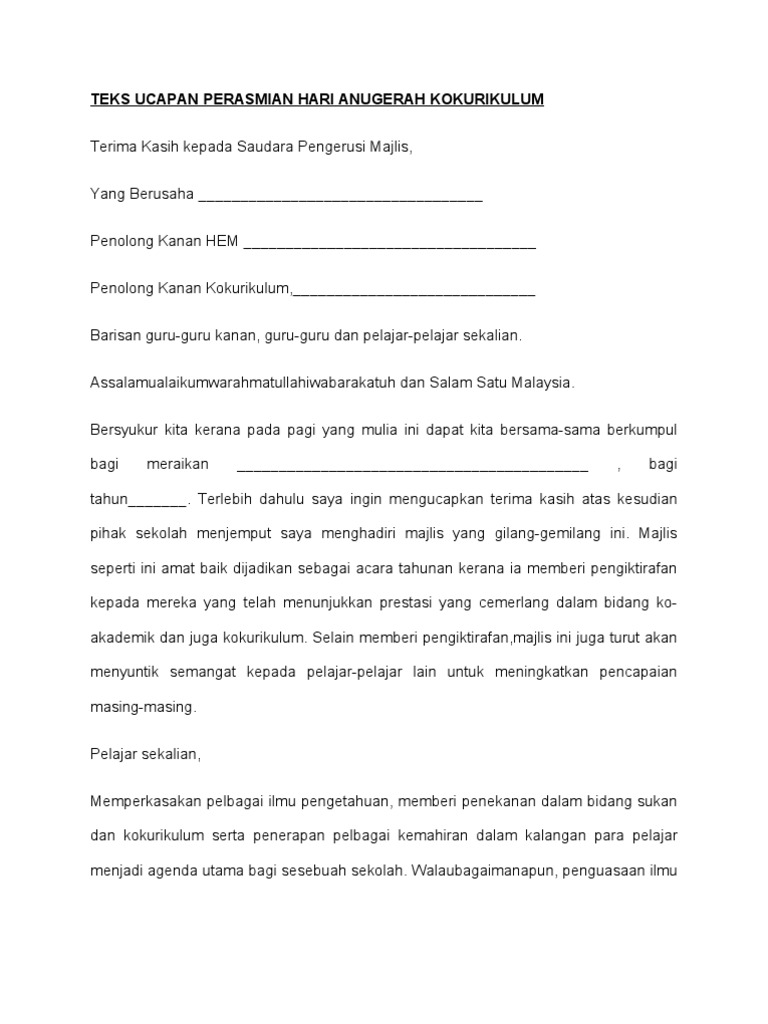 Teks Ucapan Perasmian Hari Anugerah Kokurikulum Pdf